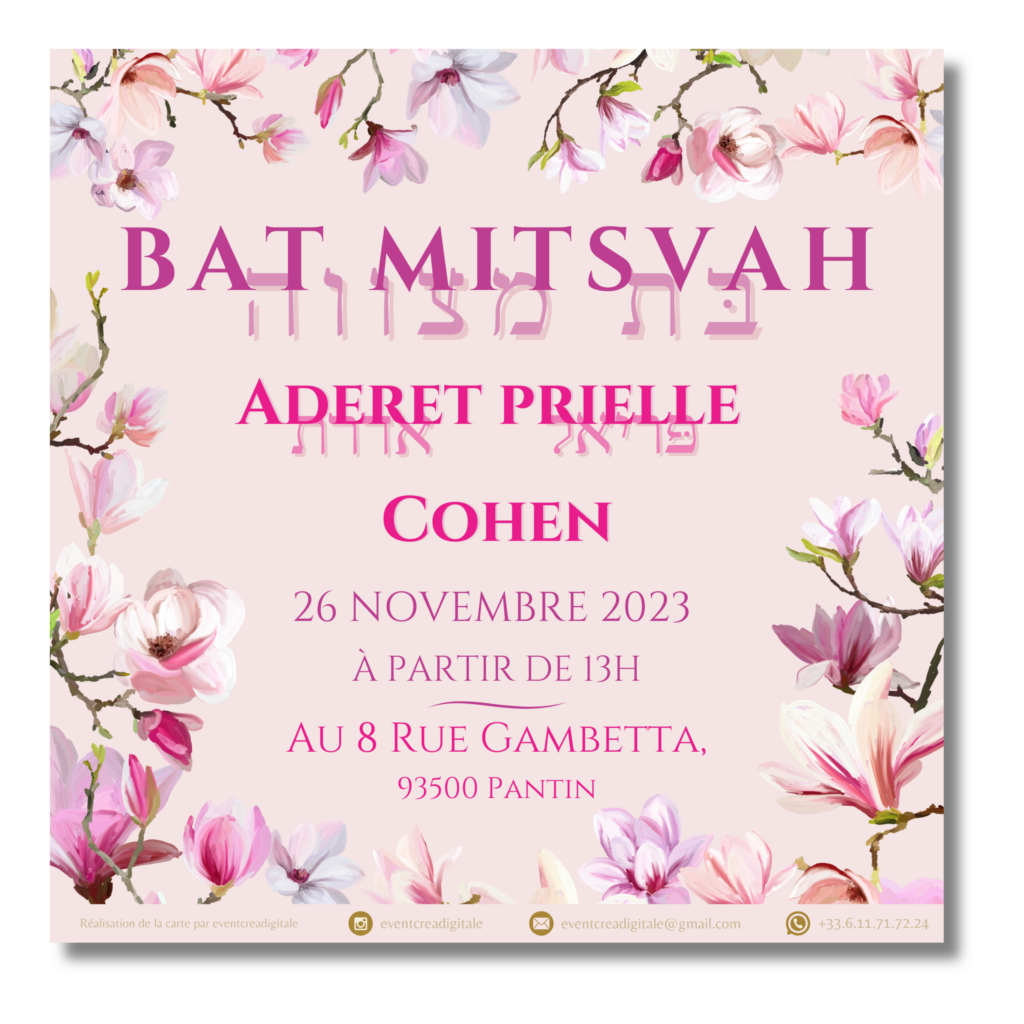Cette invitation, conçue pour la Bat Mitsvah d’Aderet Prielle, évoque une ambiance florale et délicate qui reflète la douceur et la spiritualité de cet événement unique. Les fleurs aux tons rosés et pastels incarnent la poésie et la grâce, symbolisant le lien entre le prénom d’Aderet Prielle et l’élégance naturelle.
