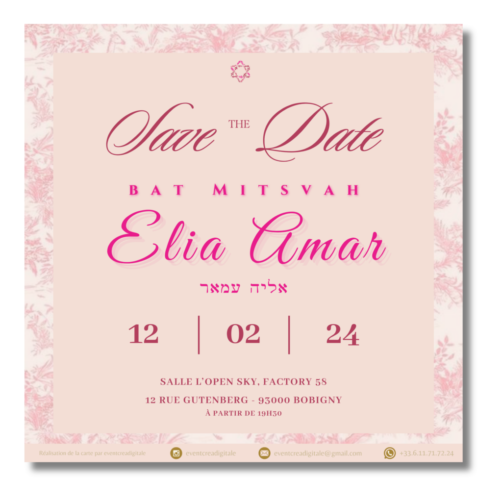 Cette carte Save The Date, créée pour la Bat-Mitsva d’Elia, incarne une parfaite combinaison de douceur et de sophistication. Le choix des tons rose poudré et fuchsia reflète à la fois la féminité et la joie qui marqueront cet événement spécial.